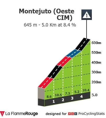 São 5 kms a 8,4%, com sectores que chegam aos dois dígitos, e que serão propícios aos ultimos ataques entre os homens que lutam pela classificação geral.