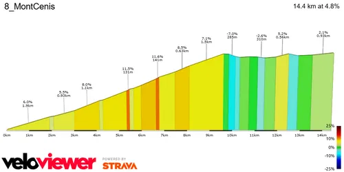 Os quilómetros iniciais têm duas subidas categorizadas onde a fuga deve conseguir formar-se antes de começar a parte principal de subidas do dia. Esta consistirá em três "subidas de aquecimento" antes de Mont Cenis. Serão 6,7Km a 6,7%; 2,5Km a 7,5% e 6,3Km a 6,1%. A última termina a 32 quilómetros do fim, o que não é muito, e não há descida a seguir.