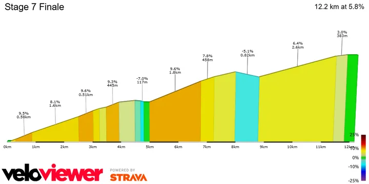 A subida para Cerler (12,1 km a 5,9%) é o ponto alto do dia. Apesar da média enganadora, o perfil esconde rampas prolongadas em torno dos 8% e duas curtas descidas que quebram o ritmo. O desenho da ascensão, sinuoso e irregular, favorece ataques nos quilómetros finais, quando já não há margem para esconder fragilidades.