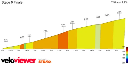 Será uma subida com muitas curvas e uma primeira metade muito dura, há uma zona de 2,5 quilómetros com uma média de quase 10% onde os ataques podem fazer a diferença. As inclinações diminuem ligeiramente nos últimos quilómetros, mas, mesmo assim, é de esperar espetáculo por parte dos melhores trepadores deste pelotão.
