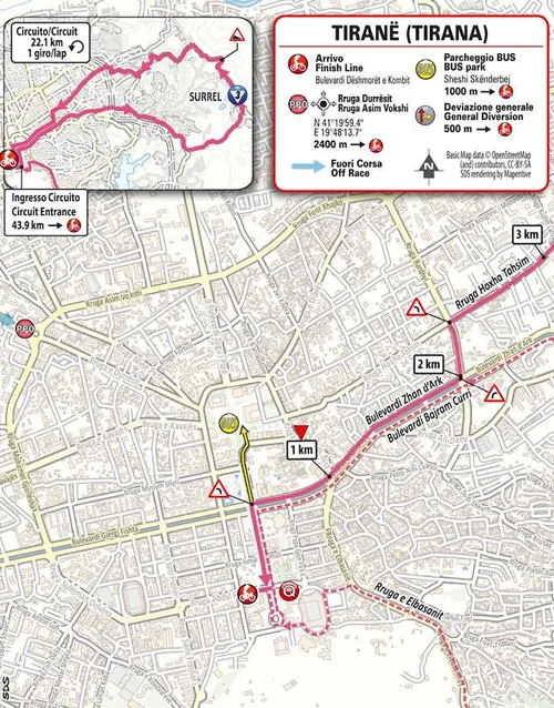 A corrida depois entra em circuito com dupla passagem pela subida de Surrel (6,9 km a 4,6%), que se assemelha em perfil à Cipressa, embora com uma rampa de 13% que pode funcionar como trampolim para ataques. A última passagem culmina a apenas 11 km da chegada. A partir daí, uma descida técnica pode servir de palco para movimentos decisivos — sobretudo porque a chegada em Tirana acontece após vários quilómetros em declive.