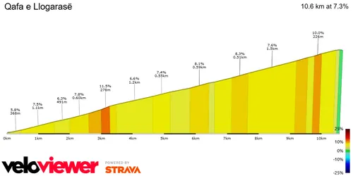A primeira metade do percurso é relativamente acessível, embora contenha uma subida de 2,2 km a quase 10% que poderá servir para eliminar desde cedo alguns sprinters mais puros. No entanto, é na segunda metade que o verdadeiro teste começa: uma sequência montanhosa culmina com a ascensão a Qafa e Llogarasë, 10,6 km a 7,3% — uma subida suficientemente exigente para provocar seleções e ataques relevantes.