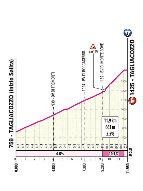 A subida final para Tagliacozzo tem 12,2 km a 5,5%, mas os últimos dois quilómetros são particularmente exigentes, com pendentes na ordem dos 10%. Quem não estiver no seu melhor corre o risco de ceder tempo significativo e entrar na fase decisiva da Corsa Rosa sob pressão.