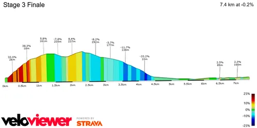 Os últimos 3 km são relativamente planos, mas é provável que vejamos ataques sucessivos entre os favoritos, numa luta pela vitória e por segundos preciosos na geral.