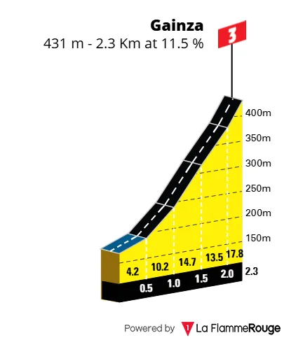 Apesar do perfil montanhoso, os dois primeiros terços da etapa servem sobretudo para acumular fadiga. As subidas iniciais não deverão ter grandes movimentações, funcionando mais como filtro natural. No entanto, a atenção deve centrar-se na subida de Gainza, a mais exigente do dia, com 2,3 km a 11% de inclinação média, e zonas muito íngremes no topo. Embora o seu topo esteja a 37 km do final, poderá provocar danos importantes nas pernas de quem sonha lutar pela vitória.