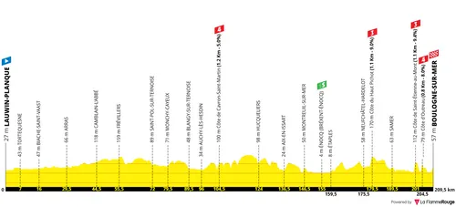A 30 quilómetros do final, há uma subida de 1,1 quilómetros a 9% e, depois, uma outra subida de caraterísticas semelhantes, com o alto a apenas 8 quilómetros do final. Aqui podemos ver ataques, pois a descida é muito rápida e depois temos outra subida muito explosiva de 800 metros a 8%, que termina a apenas 4 quilómetros do fim. Esta subida será perigosa caso hajam cortes e os ataques poderão ser bem sucedidos, pois será muito difícil organizar qualquer perseguição. A descida para Boulogne-sur-Mer será muito rápida e os ciclistas chegarão à subida final muito rapidamente.