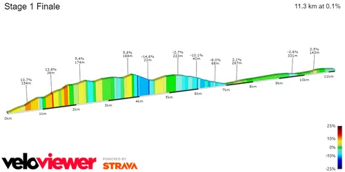 Uma delas é de 700 metros a 13% que atinge o topo a 36,5 quilómetros do fim, seguido de estradas ondulantes. Este é particularmente um local atrativo para atacar, mas talvez demasiado cedo para o gosto de alguns ciclistas - embora se fosse uma clássica, sem dúvida que haveria ação aqui.