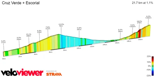 Depois, a corrida pode estabilizar um pouco, mas isso não significa que se torne mais fácil. O pelotão enfrenta o Puerto de la Cruz Verde, que tem 7,3 quilómetros a 3,9%, apresentando um final mais íngreme do que a inclinação média sugere. A descida é íngreme e rápida para a subida final. Os ciclistas entram em San Lorenzo de El Escorial, cidade que acolheu em muitas ocasiões o final da etapa quando estas montanhas são abordadas.