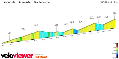 Seguem-se duas voltas a um circuito com La Escondida (8,8Km; 4,2%), Alto de Santa Maria de Alameda (5Km; 5,6%) e o Alto de Robledondo (3,9Km; 6,2%). Esta pode ser uma parte fundamental do percurso, no espaço de 32 quilómetros os ciclistas encontram quatro subidas e nada mais do que descidas pelo meio, sem qualquer tipo de terreno plano (em ambas as voltas). Na passagem final, terão 84, 67 e 61 quilómetros até à meta. Depois da descida, vem outra subida não classificada com 2,6Km a 6,8% que termina a 46 quilómetros da meta em Guadarrama.