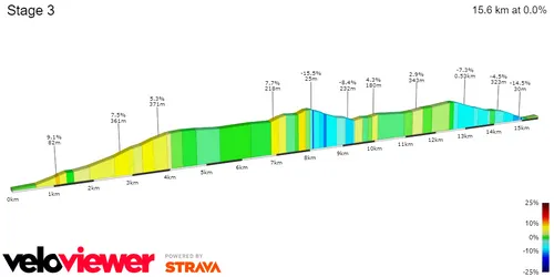 Os ciclistas vão subir de 635 para 853 metros de altitude nos primeiros 7,5 quilómetros até ao ponto intermédio. Isto significa que toda esta secção tem uma inclinação média de cerca de 4%, enquanto a secção mais difícil é de 1,8 quilómetros a 6,5%. Esta subida demora alguns minutos e pode, sem dúvida, criar diferenças significativas no grupo