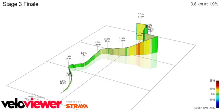 Honestamente, um sprint é difícil de evitar, mas é possível. No início do último quilómetro, temos uma rampa que sobe para 11%, a subida será muito rápida e espero alguns ataques - o último quilómetro tem algumas curvas que dificultarão a sua recuperação. Um último quilómetro sinuoso e uma curta reta final com uma inclinação de 5%. Espera-se um final muito explosivo e provavelmente emocionante.