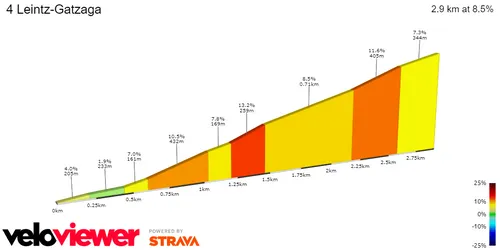 Depois de uma secção plana, os ciclistas dirigem-se para a subida de Leintz-Gatzaga, a mais decisiva do dia. São 2,9 quilómetros a 8,%, que chegam aos 12%. A subida é explosiva, dura e com algumas curvas. A subida termina quando faltam apenas 10 quilómetros para a meta.