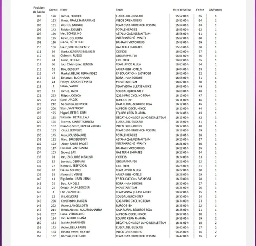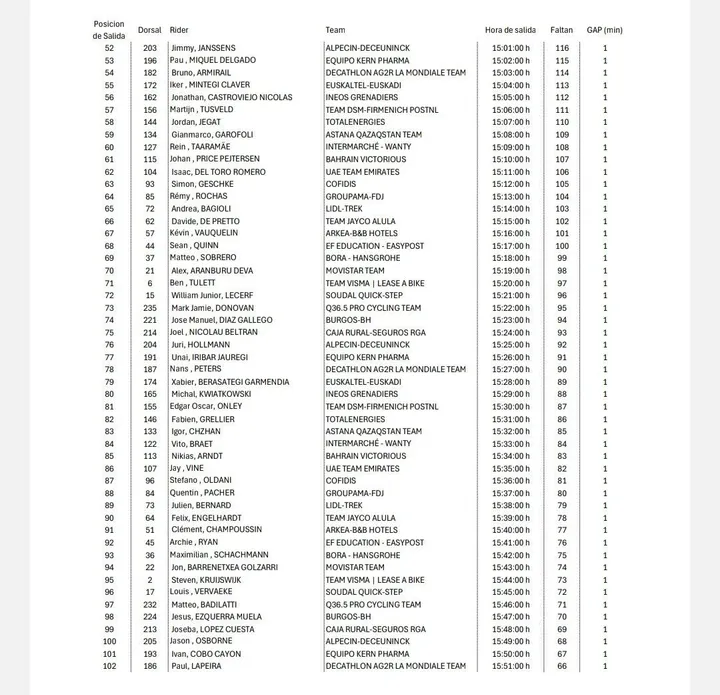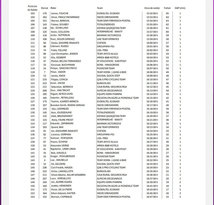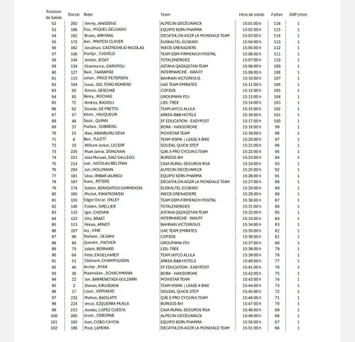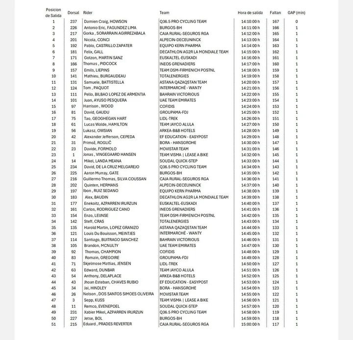 É de salientar que os principais favoritos à vitória na etapa vão começar cedo. Podemos ver a partida de Juan Auso às 14:23h, Primoz Roglic às 14:30h, Jonas Vingegaard às 14:32h e Remco Evenepoel às 14:57h.