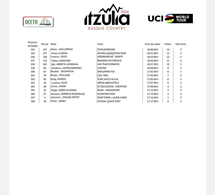 Damien Howson, da Q36.5 Pro Cycling Team, será o primeiro ciclista a sair da rampa de partida, às 14h10, enquanto Pieter Serry, da Soudal - Quick-Step, será o último, às 17h17;