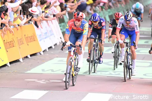Jonathan Milan, que conquistou em Laval a sua primeira vitória em etapas na Grand Boucle. Foi um momento de orgulho nacional para os italianos, que voltaram a saborear uma vitória no Tour seis anos após o último triunfo de Vincenzo Nibali em 2019.