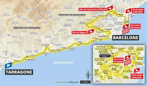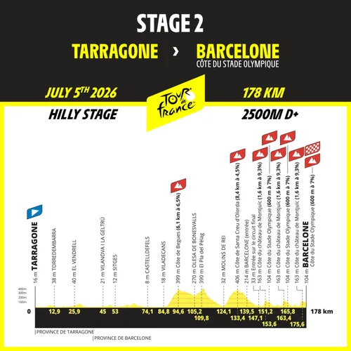 A organização da Volta a França criou um percurso que tem um final no topo de uma colina. Os ciclistas subirão ao Alto de Montjuic, por um lado fácil... No entanto, os últimos 800 metros serão a 7% até ao Estádio Olímpico, o que constituirá um desafio emocionante para o dia de abertura.