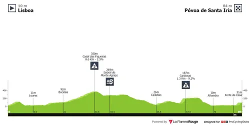 A ultima etapa da Volta a Portugal Feminina começa em Lisboa e será a mais curta da prova. Curta mas dificil, pois o terreno é ondulante, o pelotão subirá para o Alto das Figueiras (8,6kms a 2,5%) e terá o verdadeiro obstáculo do dia na subida para as Cardosas (1,3 kms a 9,2%). Uma vez atingido o topo da subida as ciclistas estarão a pouco mais de 20 quilometros da meta, que será em ligeira subida para a Póvoa de Santa Iria, pelo que qualquer ataque que surja, poderá ser difícil de fechar.