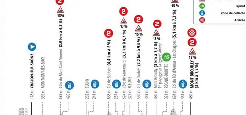 Um etapa que será uma montanha russa, cheio de subidas durante todo o dia. 4,5Km a 6,1% (94Km para terminar), 3,2Km a 6,8% (79Km para terminar) e 2,2Km a 9,1% (56Km para terminar) são um grande aquecimento. Os ciclistas sobem então pela primeira vez ao Monte Brouilly, uma subida de 2,9 quilómetros a 7,8%, cujas inclinações vão até 15%. A primeira subida chega ao topo a 39 quilómetros do fim.