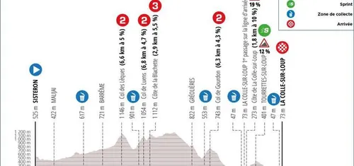 Pelo meio, uma subida de 6,3 quilómetros a 4,3%, que termina a 59 quilómetros do fim. A principal subida do dia será então a Côte de la Côte-sur-Loup, que começa logo após uma primeira passagem pela meta.