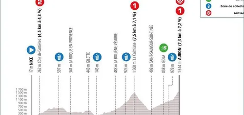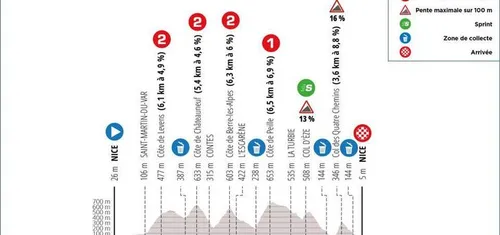 No entanto, desta vez, ainda faltam duas subidas difíceis. Os ciclistas têm um sprint intermédio no Col d'Èze, que tem 1,6 quilómetros e mais de 9% de inclinação, e que chega ao topo a 25 quilómetros do fim. Os ataques podem certamente acontecer aqui, porque a descida rápida que se segue conduz diretamente à última subida do dia.