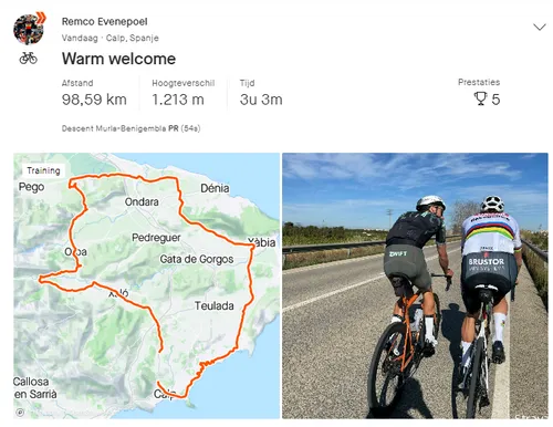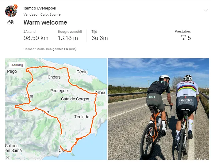 Numa publicação na sua conta oficial do Strava, Evenepoel mostrou um percurso de treino de 98,59 km, percorrido em pouco mais de três horas em Calpe, Espanha. A imagem também foi partilhada com a estrela da Soudal - Quick-Step a pedalar ao lado de van der Poel.