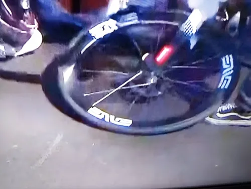 De seguida apresentam-se fotografias, que não sendo da melhor qualidade, dá para ver que a roda traseira da Colnago de João Almeida não tem pneu. É a única bicicleta que não tem pneu na amalgama de carbono que ali está.